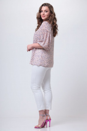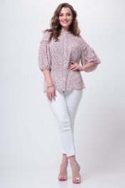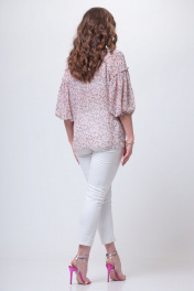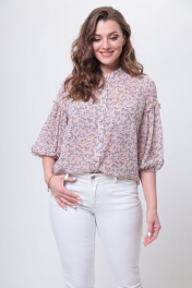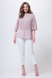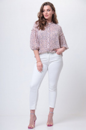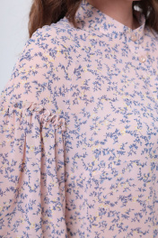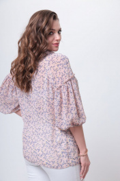 Блузка прямого, свободного силуэта, выполнена из шифона с набивным рисунком. Полочка блузки с центральной застежкой по планке на петли и пуговицы, с нагрудными вытачками. Горловина круглой формы, обработана воротником-стойкой. Спинка цельная. Рукав реглан, состоящий из верхней и нижней частей. Нижняя часть рукава со сборкой в виде рюши. По низу рукав на резинке.