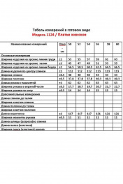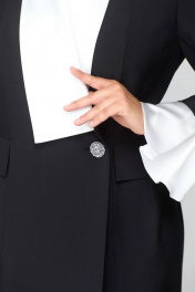 Платье полуприлегающего силуэта, длиной за колено, выполнено из однотонной ткани, в качестве отделки использована контрастная по цвету ткань с легким атласным эффектом. Полочка платья с вертикальными рельефами в верхней части и с отрезной боковой нижней частью с талиевой вытачкой и декоративным клапаном. Застежка двубортная, на петлю и пуговицу. Горловина V-образной формы, обработана воротником типа “апаш” из отделочной ткани. Спинка со средним швом и вертикальными рельефами. Рукав длинный, втачной, двухшовный. По низу рукав обработан манжетой в виде волана из отделочной ткани.