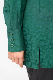 Блузка прямого, свободного силуэта выполнена из однотонной ткани с жаккардовым эффектом рисунка под леопард. Полочка блузки с центральной застежкой в виде притачной планки на петли и пуговицы. Полочка блузки с нагрудными вытачками. Горловина круглой формы, обработана воротником рубашечного типа. Спинка с отрезной плечевой кокеткой и складкой по центру спинки. Пройма углубленной формы, рукав рубашечного типа, одношовный. В нижней части боковых швов выполнены разрезы. Рукав по низу со складками и на притачной манжете с застежкой на петли и пуговицы