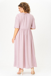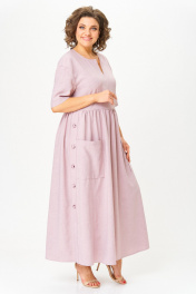 Платье свободного силуэта, длиной макси. Платье выполнено из однотонной ткани с легким эффектом “крэш”. Лиф платья отрезной по линии талии. Полочка лифа с нагрудными вытачками и средним швом в верхней части которого обработан разрез. Спинка лифа цельная с талиевыми вытачками. Горловина круглой формы. Пройма углубленной формы. Рукав одношовный, длиной до локтя. Юбка со сборкой по шву притачивания к лифу. По боковым швам обработаны притачные планки с застежкой на петли и пуговицы. На передней части юбки обработаны накладные карманы.