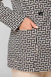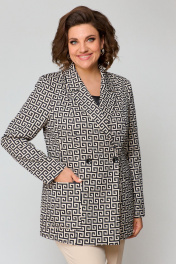 Костюм состоит из жакета и брюк. Жакет прямого силуэта, НА ПОДКЛАДКЕ, с набивным рисунком. Полочка жакета с вертикальными рельефами и двубортной застежкой на две пуговицы. Горловина V-образной формы. На нижней части полочки выполнены накладные карманы. Спинка со средним швом и отрезными бочками. Рукав длинный, втачной, двухшовный. Брюки однотонные со стрелками, длиной до косточки. В верхней части брюки прилегающие, в колене свободные и к низу зауженные. По передним половинам обработаны карманы, в среднем шве застежка на молнию. На задней половине обработаны талиевые вытачки. Брюки на притачном поясе с эластичной тесьмой и шлевками. Застежка по поясу на петлю и пуговицу.