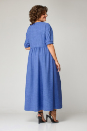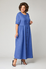 Платье свободного силуэта, длиной макси, выполнено из однотонной ткани. Платье с отрезным лифом и с центральной застежкой на петли и пуговицы. Полочка лифа с нагрудными вытачками и вертикальными защипами, горловина круглой формы с притачной планкой. Спинка с талиевыми вытачками. Пройма углубленной формы. Рукав рубашечного типа, одношовный, длиной до локтя. По низу рукава обработана притачная манжета с эластичной тесьмой. Юбка платья с вертикальными рельефами по передней и задней частям, со сборкой по шву притачивания к лифу. В боковых швах обработаны прорезные карманы.