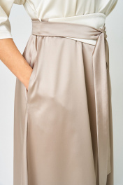 Платье выполнено из однотонной ткани с атласным эффектом в сочетании двух цветов. Платье длинной макси с акцентом в области талии в виде съемного пояса "кушак". Платье отрезное по линии талии. Полочка с горловиной овальной формы. Спинка со средним швом, в верхней части которого обработана капля-разрез с застежкой на навесную петлю и пуговицу. Рукав одношовный длиной 3/4. Юбка формы колокол. В боковых швах юбки обработаны карманы. По талии платье с эластичной тесьмой. В боковых швах лифа обработаны шлёвки, через которые продевается пояс-кушак.