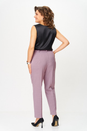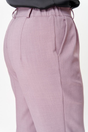 Брюки со стрелками, зауженные к низу. По передним половинкам выполнены наклонные карманы и складки по талии. По задним половинкам обработаны талиевые вытачки. В среднем шве передней половинки брюк обработана застежка на молнию. Брюки на притачном поясе с эластичной тесьмой и застежкой на петлю и пуговицу.