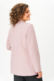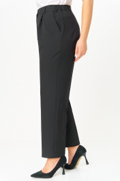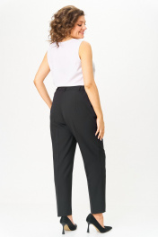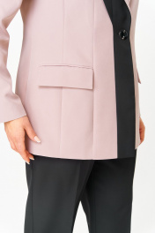 Костюм состоящий из жакета и брюк выполнен из однотонной ткани в контрастном сочетании светлого и темного цветов. Жакет полуприлегающего силуэта, на подкладке. Полочка жакета с центральной застежкой на петлю и пуговицу, с вертикальными рельефами, прорезным карманом в рамку и клапаном. Правая часть полочки с отрезной центральной частью, выполненной из контрастной ткани. В верхней части правой полочки обработан декоративный элемент в виде отложного лацкана из контрастной ткани. Горловина V-образной формы с отложными лацканами и воротником пиджачного типа. Спинка со средним швом и вертикальными рельефами. Рукав втачной, двухшовный. Брюки со стрелками, зауженные к низу. По передним половинкам выполнены наклонные карманы и складки по талии. По задним половинкам обработаны талиевые вытачки. В среднем шве передней половинки брюк обработана застежка на молнию. Брюки на притачном поясе с эластичной тесьмой и застежкой на петлю и пуговицу.