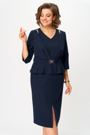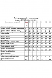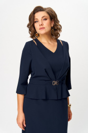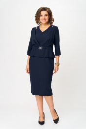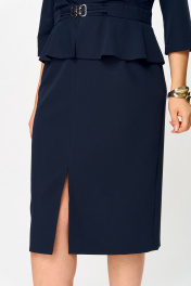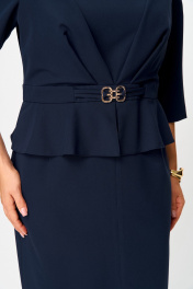 Платье полуприлегающего силуэта, длиной за колено, выполнено из однотонной ткани. Платье с отрезным лифом, полочка лифа с рельефами, горловиной V-образной формы и отлетной частью полочки со складкой по шву притачивания к поясу. Спинка лифа с вертикальными рельефами и центральным швом с потайной молнией. Юбка платья прилегающая по бедрам с талиевыми вытачками и разрезом в среднем шве передней половинки юбки. Между лифом и юбкой обработан пояс с декоративным элементом в виде пряжки и баской.
