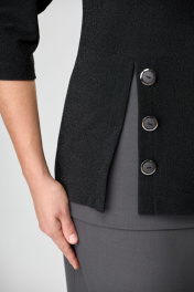 Костюм выполнен из 2-х видов ткани. Джемпер выполнен из трикотажного полотна. Юбка из костюмной ткани. Силуэт полуприталенный, со спущенной линией плеча.Полочка джемпера разрезная, нижняя часть двухслойная. На правой части в качестве отделки- пуговицы. Горловина круглой формы, рукав 3/4. Юбка, прилегающая по бедрам и зауженная к низу, длина чуть ниже колена, задняя часть юбки со шлицей. Пояс притачной с эластично тесьмой и застежкой на петлю и пуговицу.