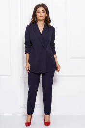 Костюм состоит из жакета и брюк. Костюм выполнен из однотонной ткани. Жакет прямого силуэта, на подкладке. Полочка жакета с вертикальными рельефами и двубортной застежкой на две пуговицы. Горловина V-образной формы. На нижней части полочки выполнены накладные карманы. Спинка со средним швом и отрезными бочками. Рукав длинный, втачной, двухшовный. Брюки со стрелками, длиной до косточки. В верхней части брюки прилегающие, в колене свободные и к низу зауженные. По передним половинам обработаны карманы, в среднем шве застежка на молнию. На задней половине обработаны талиевые вытачки. Брюки на притачном поясе с эластичной тесьмой и шлевками. Застежка по поясу на петлю и пуговицу.