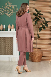 Жакет полуприлегающего силуэта, выполнен из однотонной ткани. Жакет на подкладке. Полочка жавета с центральной двубортной застежкой на шесть пуговиц. Воротник пиджачного типа на стойке, лацканы отложные. Жакет с вертикальными рельефами по полочке и по спинке, и отрезной по линии талии. Боковая часть в нижней части жакета со складками. Рукав втачной, двухшовный, длинный. По линии талии настрочены шлевки, через которые продет пояс с пряжкой.