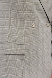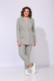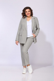 Костюм выполнен из ткани в клетку, состоит из жакета и брюк. Жакет прямого силуэта, на подкладке. Полочка жакета с вертикальными вытачками, отрезными бочками и двубортной застежкой на две пуговицы. Горловина V-образной формы. На нижней части полочки расположены прорезные карманы с клапанами. Спинка со средним швом и отрезными бочками. Рукав длинный, втачной, двухшовный. Брюки со стрелками, длиной до косточки. В верхней части брюки прилегающие, в колене свободные и к низу зауженные. По передним половинам обработаны карманы, в среднем шве застежка на молнию. На задней половине обработаны талиевые вытачки. Брюки на притачном поясе с эластичной тесьмой и шлевками. Застежка по поясу на петлю и пуговицу.