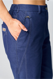 Брюки женские, выполнены из джинсовой ткани. Передние половинки с вертикальными подрезами, с боковыми карманами, задние половинки с кокетками и накладными карманами. Застёжка спереди на молнию, пояс по спинке с резинкой. По подрезам, карманам, шаговым и среднему швам проложены двойные отделочные строчки.