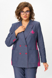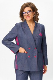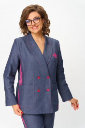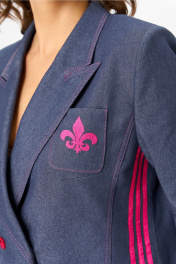 Красивый женский джинсовый жакет не оставит равнодушной ни одну модницу! Полуприлегающий классический покрой подчеркнет достоинства фигуры, а плотная ткань обеспечит комфорт в любой ситуации. Жакет с застёжкой спереди на петли и пуговицы, с пиджачным воротником и втачными двухшовными рукавами со шлицами и акцентными пуговицами. По переду выполнены боковые накладные карманы и нагрудный накладной карман с вышивкой, по боковым деталям переда три отделочные детали, спинка со швами. По деталям жакета проложены отделочные строчки контрастного цвета.
