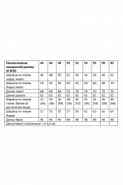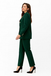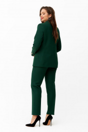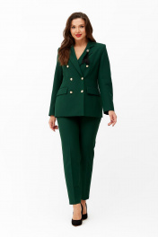 Костюм женский двухпредметный, состоящий из жакета и брюк. Жакет двубортный полуприлегающего силуэта, на подкладке, с воротником пиджачного типа, застежка на петли пуговицы. Перед с талевыми вытачками и отрезными бочками, с прорезными карманами с клапанами. Спинка со средним швом. Рукава двухшовные втачные со шлицей на пуговицах. Брюки женские, полуприлегающего силуэта, на притачном поясе с эластичной тесьмой сзади, с застежкой спереди на тесьму молнию и петлю пуговицу. Передние половинки с двумя наклонными боковыми карманами.