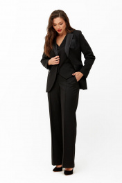 Костюм женский трех предметный, состоящий из жакета, жилета и брюк, выполнен из черной поливискозы в мелкую полоску со слегка уловимым блеском и отделкой из экокожи. Жакет полуприлегающего силуэта с центральной застежкой на петли и пуговицы, с пиджачным воротником, с втачными рукавами. Перед с нагрудными вытачками, отрезными бочками, прорезными карманами «в рамку» с клапаном и нагрудным накладным карманом. Спинка с отрезными бочками и средним швом. Рукава двухшовные со шлицей. Борта, воротник, клапаны и карман жакета выполнены из экокожи. Изделие на подкладке. Жилет полуприлегающего силуэта с центральной застежкой на петли и пуговицы. Перед с отрезными бочками и прорезными карманами, спинка с отрезными бочками, средним швом и хлястиком. Горловина V-образной формы, низ фигурный. Изделие на подкладке. Брюки прямые палаццо, по переду с карманами, с застежкой на тесьму-молнию, задние половинки с талевыми вытачками. Изделие на поясе с эластичной резинкой сзади