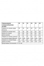 Костюм женский, состоящий из блузки и брюк. Блузка прямого силуэта на запа́х. По переду со складками от плеча, отрезная по линии талии, спинка с кокеткой. Рукав втачной одношовный, длиной 3/4, со сборкой по окату. Блузка со съемным поясом с украшением «кисточки». Брюки женские свободного кроя, на притачном поясе с эластичной тесьмой, с имитацией застежки. Передние половинки с двумя наклонными боковыми карманами