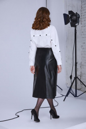 Юбка длины midi из эко кожи. Силуэт трапеция, застежка спереди на цельнокроеную планку на петли и пуговицы. На талии пояс, также с пуговицей спереди. Спереди по бокам прорезные наклонные карманы с металлическими молниями и двойной отделочной строчкой. В области колена на юбке подрез с двойной отстрочкой. Юбка на отлетной подкладке