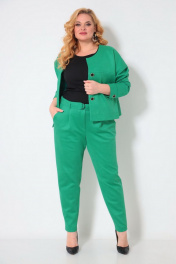 Стильный женский комплект, состоящий из укороченного жакета и брюк. Комплект изготовлен из мягкого, приятного к телу, полотна модной расцветки. Жакет свободного силуэта, на подкладке, рукав рубашечный на застегивающейся манжете. Брюки зауженные к низу. Застежка на молнию по переду. Верх брюк на поясе со шлeвками. Добавлен пояс в брюках из основной ткани. В боковых швах карманы.