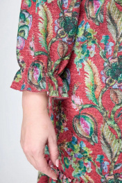 Платье из смесовой ткани с красивым, акварельным принтом. Прямой силуэт. Втачные укороченные рукава, понизу присборены на резинке. Вырез горловины округлый с декоративным элементом-цепочкой. Низ платья украшает притачной волан. Элегантное платье для ваших мероприятий. Замеры: Рост фотомодели – 170 см. размер фотомодели – 54 Размер 56: ОГ-124;ОТ-128; ОБ-128; ДИ-98; ДР- 53. Размер 58: ОГ-128;ОТ-132; ОБ-132; ДИ-98; ДР-53. Размер 60: ОГ-132;ОТ-136; ОБ-136; ДИ-98; ДР- 53.