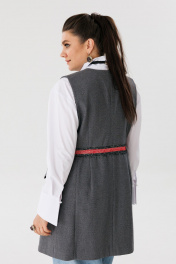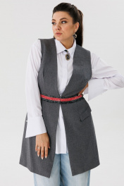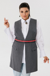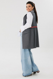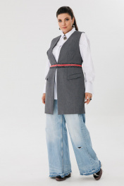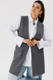 Жилет удлинённый из ткани костюмно-плательного ассортимента с отделкой по линии талии. Полуприлегающий силуэт,низкий v-образный вырез горловины удлиняет силуэт.По переду функциональные карманы с фигурным клапаном. На модели рубашка 1203.1. Замеры: Размер 48: ОГ-98; ОТ-88; ОБ-112; ДИ-86; Размер 50: ОГ-102; ОТ-90; ОБ-114; ДИ-85; Размер 52: ОГ-106; ОТ-92; ОБ-118; ДИ-86; Размер 54: ОГ-110; ОТ-96; ОБ-122; ДИ-85.