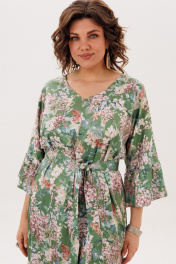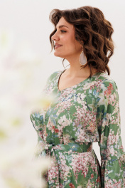 Платье из вискозы, словно созданное для мягкости и комфорта, окутывает фигуру свободным прямым силуэтом, позволяя чувствовать себя легко и непринужденно. Элегантный V-образный вырез с шнуровкой на спинке добавляет образу женственности и утонченности, открывая небольшой намек на спину и создавая изысканный силуэт. Цельнокроенные рукава с игривыми воланами и притачной волан по низу придают нарядность и динамику, словно платье танцует вместе с вами. Съемный пояс дает возможность менять акценты, подчеркивая талию или оставляя образ свободным, а аккуратные функциональные карманы добавляют практичности без ущерба для эстетики. Тонкая, нежная ткань с принтом «акация в саду» словно обволакивает тело, даря ощущение легкости и свободы движений, в таком платье хочется кружиться, шутливо игриво расставляя оборки, которые будто отражают настроение и настроение того, кто его носит. Каждый элемент, от шнуровки до воланов, продуман с любовью, создавая гармонию между комфортом и легкой романтичной элегантностью, делая этот образ одновременно воздушным и чувственным. Замеры: Размер 52: ОГ-120; ОБ-122; ОП-44; ДИ от плечевого шва - 137; ДР-51; Размер 54: ОГ-124; ОБ-127; ОП-46; ДИ от плечевого шва - 139; ДР-53; Размер 56: ОГ-128; ОБ-132; ОП-48; ДИ от плечевого шва - 140; ДР-54; Размер 58: ОГ-132; ОБ-137; ОП-48; ДИ от плечевого шва - 140; ДР-53; Размер 60: ОГ-136; ОБ-141; ОП-50; ДИ от плечевого шва - 140; ДР-54; Размер 62: ОГ-140; ОБ-145; ОП-50; ДИ от плечевого шва - 141; ДР-55;