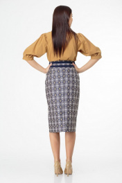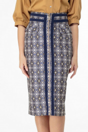 Юбка из принтованного жаккарда с отделочными деталями из экокожи. Прямой силуэт, притачной пояс с элементами отделки. Застёжка по переду по всей длине юбки на металлической разъемной молнии. Декоративные клапаны расположены в шве притачивания пояса. Выполнена на подкладке. Геометрический принт ткани с вертикальными отделочными деталями визуально «вытягивают»фигуру, подчеркивают линию талии. Замеры: ОГ- обхват груди; ОТ-обхват талии; ОБ-обхват бедер; ДИ-длина изделия; ДР-длина рукава. Рост фотомодели – 171 см. Размер фотомодели-44. Размер 44 ОТ-74 ОБ-104 ДИ-70 Размер 46 ОТ-78 ОБ-108 ДИ-70 Размер 48 ОТ-82 ОБ-112 ДИ- 70 Размер 50 ОТ-86 ОБ-116 ДИ-71 Размер 52 ОТ-90 ОБ-120 ДИ- 71