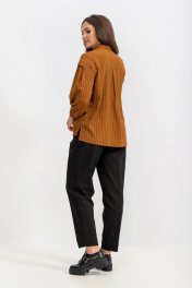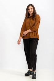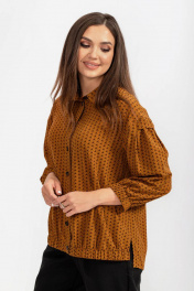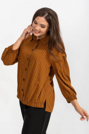 Блуза свободного облегания со спущенным плечом и разно уровневым низом. По переду планка с застёжкой на восемь прорезных петель и пуговиц. По низу полочки резинка. По спинке кокетка с бантовой складкой. Рукава одно шовные втачные широкие, по низу резинка. Воротник отложной на стойке. Боковые швы блузы заканчиваются небольшими разрезами.