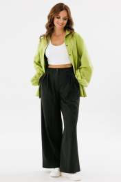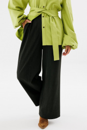 Брюки-палаццо - базовая модель повседневного гардероба. Они зрительно удлинят силуэт и вытянут фигуру. С такой моделью брюк можно легко составить множество повседневных образов. Брюки широкие длинные с высокой посадкой. На передних половинках складки. Пояс притачной с застежкой на молнию, петли и пуговицы, со вставками эластичной тесьмы по бокам. В боковых швах расположены карманы с косым входом. Длина брюк (с поясом): 107 см