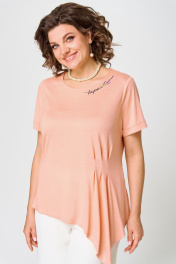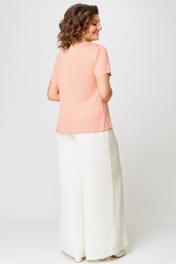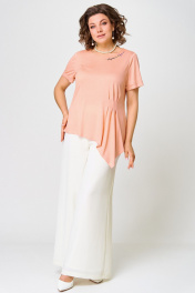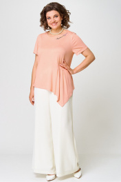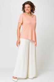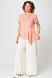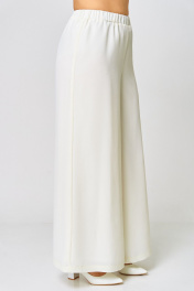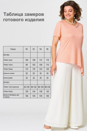 Базовый брючный комплект состоит из оригинальной блузки и широких брюк-палаццо. Блузка из тонкого однотонного трикотажного полотна с элегантными защипами по талии подчеркнет Вашу женственность и романтичность. Удлиненную блузку дополняют комфортные брюки свободного силуэта из струящегося шифона, которые помогут скрыть недостатки и вытянуть фигуру. Блузка полуприлегающего силуэта с ассиметричным низом. Горловина округлой формы декорирована принтом. Перед с нагрудной вытачкой и декоративными вертикальными защипами по талии. Спинка со средним швом. Рукав втачной короткий с манжетой. Длинные широкие брюки с поясом на резинке по всей ширине. Брюки не будут просвечиваться за счёт подкладки из мягкой ткани. Длина блузки: 59 см Длина брюк (с поясом): 109 см