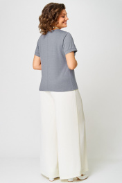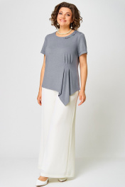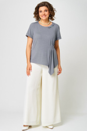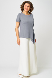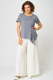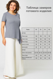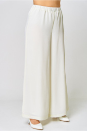 Базовый брючный комплект состоит из оригинальной блузки и широких брюк-палаццо. Блузка из тонкого однотонного трикотажного полотна с элегантными защипами по талии подчеркнет Вашу женственность и романтичность. Удлиненную блузку дополняют комфортные брюки свободного силуэта из струящегося шифона, которые помогут скрыть недостатки и вытянуть фигуру. Блузка полуприлегающего силуэта с ассиметричным низом. Горловина округлой формы декорирована принтом. Перед с нагрудной вытачкой и декоративными вертикальными защипами по талии. Спинка со средним швом. Рукав втачной короткий с манжетой. Длинные широкие брюки с поясом на резинке по всей ширине. Брюки не будут просвечиваться за счёт подкладки из мягкой ткани. Длина блузки: 59 см Длина брюк (с поясом): 109 см