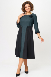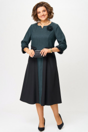 Лаконичное женское платье из двух видов ткани – просто находка для базового демисезонного гардероба. Благодаря крою, платье прекрасно садится по фигуре, выгодно подчеркивая ее достоинства и скрывая недостатки. Платье полуприлегающего силуэта, отрезное по линии талии. Горловина с фигурным вырезом, обработана обтачкой. По переду лифа — рельефные швы. По спинке лифа талиевые вытачки и средний шов, в котором обработана потайная молния. Юбка платья "клеш", с вертикальной вставкой по переду и средним швом по спинке. Подрез по талии закрывается декоративным поясом с пуговицами. Добавят комфорта при носке функциональные карманы в боковых швах. Рукав втачной прямой, длиной ¾, по низу — манжет, декорированный тесьмой и пуговицой. В комплекте к платью прилагается съемное украшение из тесьмы. Длина платья: 118 см Длина рукава: 43 см