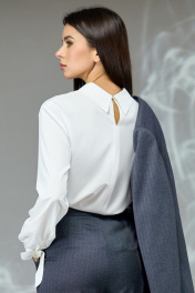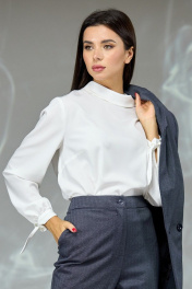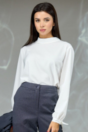 Блуза прямого силуэта до середины бедер. Воротник стоячеотложной. По спинке средний шов с капелькой, застегивающейся на навесную петельку и пуговицу. Рукав прямой, низ рукава присборен на декоративную манжету с завязками.