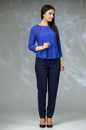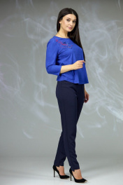 Классический женский костюм состоящий из блузы и брюк. Блуза прямого силуэта, горловина формы "лодочка". Рукав втачной спущенный. По переду изделия расположена вышивка. Брюки классические из костюмноплательной ткани, прилегающего силуэта. Задние половины брюк длиннее передних.