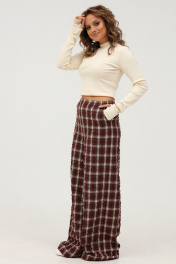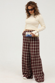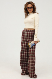 Широкие брюки в клетку - стильный элемент для создания запоминающегося образа в пижамном стиле. Свободный крой брюк создаст эффект свободы, пояс на резинке обеспечит максимальный комфорт, а ткань с "крэш" эффектом подарит легкость и практичность. Брюки подойдут для повседневной жизни и активного отдыха, будут незаменимы в путешествии и отпуске. Брюки широкие прямые с высокой посадкой. Пояс брюк на широкой резинке. В боковых швах имеются функциональные наклонные карманы. Длина брюк (с поясом): 110 см.