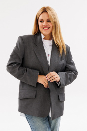 Жакет большого объема, прямого мужского силуэта, на притачной подкладке из опливискозы. Спинка со средним швом. На полочках прорезные карманы с клапаном и листочкой. На левой полочке нагрудный карман с листочкой. Линия плеч расширена. Воротник отложной, пиджачного типа. Длина жакета ниже уровня бедер 75 см, длина рукава 61 см. Размер L(50-52), XL(54-56), XXL(58-60)
