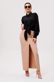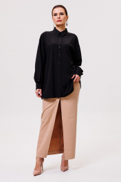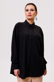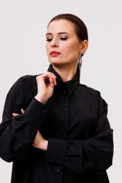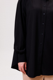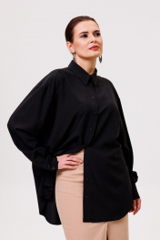 Рубашка большого объема, прямого силуэта.Ткань мягкая,приятная к телу, струится, легко утюжится. После стирки не требует много времени,чтобы привести в надлежащий вид. Универсальная модель,не слишком официальная,немного расслабленная. На детали спинки расположена двойная кокетка, переходящая на деталь полочки. Под кокеткой на спинке расположена встречная складка. Воротник рубашечный отложной на стойке. Застежка планка центральная на прорезные петли и пуговицы. Линия плеча спущенная, рукав рубашечный, длинный. В нижней части рукава заложены складки, заканчивается широкой манжетой с двумя прорезными петлями и пуговицами. Разрез рукава обработан планкой. Низ блузки разноуровневый: спереди короче, сзади длиннее. Длина изделия по спинке 73 см, длина рукава с учетом ширины плеча и шириной манжета 75 см.
