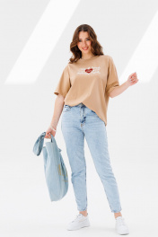 Футболка умеренного объема, прямого силуэт. Вырез горловины округлый, обработан бейкой. Рукав рубашечного покроя, длиной выше уровня локтя. Линия плеча спущена. Длина футболки ниже уровня бедер в росте 170 - 73 см. Длина рукава с шириной плеча 40 см.