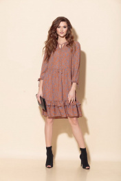 Платье свободного силуэта из шифоновой ткани с принтом, подрезом в области линии талии со сборкой и воланом по низу. Перед с V-образным вырезом и завязками с наконечником. Рукав втачной, длина - 3/4, низ на резинке. Длина платья в 44р. - 99 см., длина рукава в 44р. - 52,5 см. Длина платья в 50р. - 102см., длина рукава в 50р. - 52,5 см.