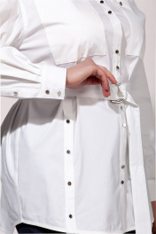 Стильная хлопковая рубашка свободного кроя со спущенной линией плеча и накладными карманами. Воротник рубашечный на отрезной стойке с центральной застежкой на петли и пуговицы. Рукав на манжете с застежкой на петли пуговицы. К изделию прилагается пояс из основной ткани.