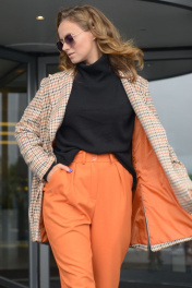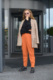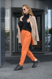 Брюки женские повседневные, зауженные к низу. На передней половинке - складки и боковые карманы, на задней - вытачки по линии талии и прорезные карманы с листочкой. Верхний срез обработан притачным поясом со шлёвками. Застёжка – на тесьму-молния в среднем шве передних половинок и две обмётанные петли и пуговицы. Низ брюк с защипами и отделочной строчкой.