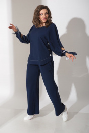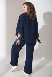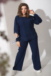 Костюм женский состоит из брюк и туники. Туника свободного покроя с удлиненной спинкой. Широкий рукав-реглан с глубокой прорезью внизу завязывается манжетой. Разрезы в боковых швах насквозь застегиваются на пуговицы. Низ на широкой обтачке из полоски, низ рукава отстрочен гарусом. Длина туники по спинке в 48р. - 66,5 см. Длина туники по спинке в 54р. - 67 см. Широкие брюки в полоску с притачным поясом на резинке. Карманы в боковых швах с потайными молниями. Длина брюк в 48р. - 108 см. Длина брюк в 54р. - 67 см.
