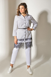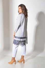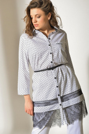Удлиненная блуза свободноьго кроя. Изделие выполнено из двух типов ткани: основная - рубашечный набивной хлопок, отделка -французское кружево. По переду сквозная застежка на пуговицы. На груди накладной карман. Длина изделия -97 см. Длина рукава -52 см.