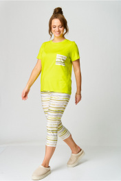 Костюм женский брючный из вискозы для сна и отдыха. Блуза прямого силуэта длиной до середины бедра. Спереди нагрудный накладной карман. Рукава втачные одношовные короткие. Горловина обработана бейкой. Брюки полуприлегающего силуэта длиной до середины икры. Спереди обработаны карманы с отрезным бочком. Пояс на резинке с фиксирующим шнурком.