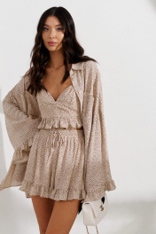 Шорты прямого кроя выполнены из струящегося полотна с принтом миниатюрные сердечки. Характеристики: прямой крой, пояс на резинке с кулисой, в боковых швах карманы, по низу шорт нашита рюша из ткани основного изделия. Длина 39 см.