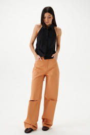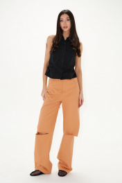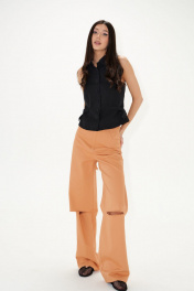 Брюки прямого кроя с декоративными разрезами выполнены из джинсового полотна.Характеристики: прямой крой, пояс стабильный, по поясу нашиты шлевки, по переду прорезные карманы, по заднему полотну накладные карманы. По заднему и переднему полотну брюк декоративные разрезы. Длина 114 см.