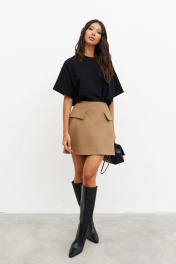 Юбка выполнена из мягкой ткани светло-коричневого цвета (имитация замши). Характеристики: полуприлегающий А-образный силуэт, подкладка, застежка - потайная тесьма молния в среднем шве заднего полотна, по переду имитация карманов с клапаном. Длина по поковому шву 43 см.