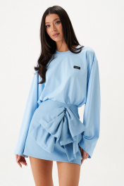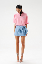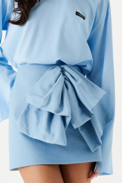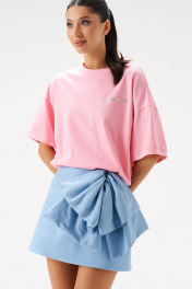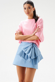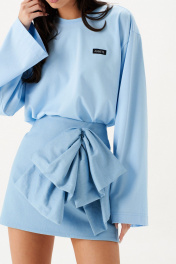 Юбка А-образного силуэта длины мини из тонкого денима. По переду изделия объёмный декоративный бант. В заднем среднем шве изделия потайная молния. Длина по боковому шву 39 см.