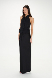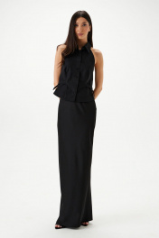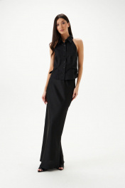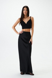 Юбка полуприлегающего силуэта выполнена из струящегося полотна черного цвета. Характеристики: полуприлегающий силуэт, пояс на резинке. Длина по боковому шву 109 см.