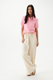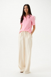 Брюки выполнены из текстильной ткани, молочного цвета в вертикальную полоку.Характеристики: прямой свободный крой, пояс на кулиске, в боковых швах карманы. Длина брюк по боковому шву 111 см.