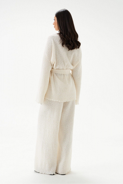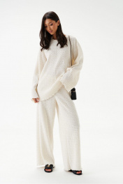 Брюки свободного кроя выполнены из полотна "букле-венгерка" молочного цвета. Характеристики: прямой крой, пояс на резинке на подгибе. Длина 103 см.