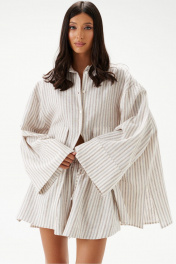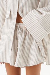 Шорты выполненные из льняного полотна. Характеристики: широкие, короткие, пояс притачной на резинке, кулиска. В боковых швах карманы с отрезным бочком. Низ обработан в подгибку с закрытым срезом. Длина по боковому шву 34 см